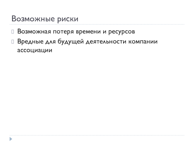 Возможные рискиВозможная потеря времени и ресурсовВредные для будущей деятельности компании ассоциации