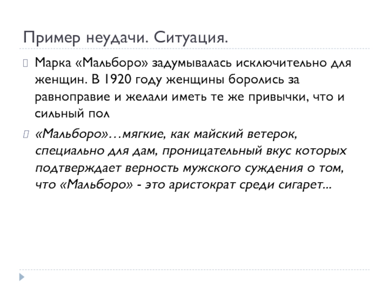 Пример неудачи. Ситуация.Марка «Мальборо» задумывалась исключительно для женщин. В 1920 году женщины боролись за равноправие и желали