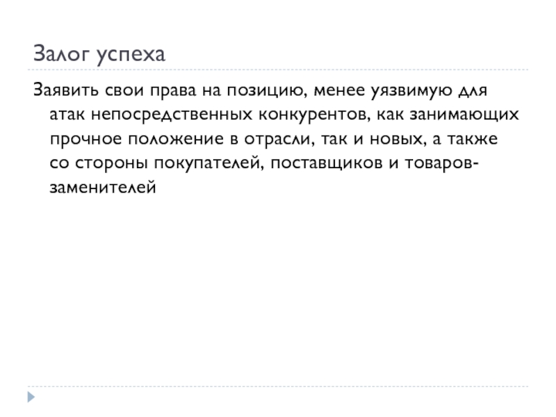 Залог успехаЗаявить свои права на позицию, менее уязвимую для атак непосредственных конкурентов, как занимающих прочное положение в