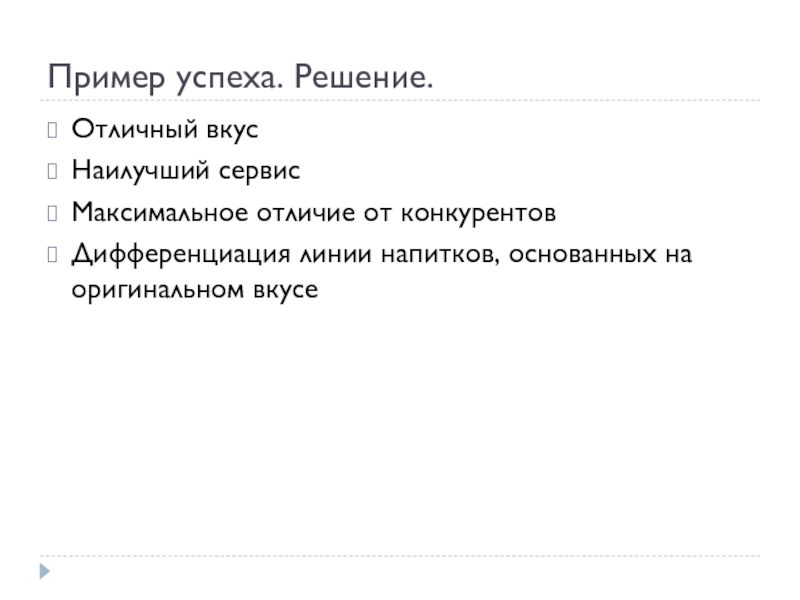 Пример успеха. Решение.Отличный вкусНаилучший сервисМаксимальное отличие от конкурентовДифференциация линии напитков, основанных на оригинальном вкусе