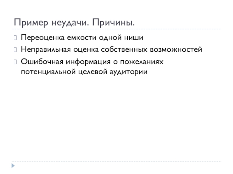 Пример неудачи. Причины.Переоценка емкости одной нишиНеправильная оценка собственных возможностейОшибочная информация о пожеланиях потенциальной целевой аудитории