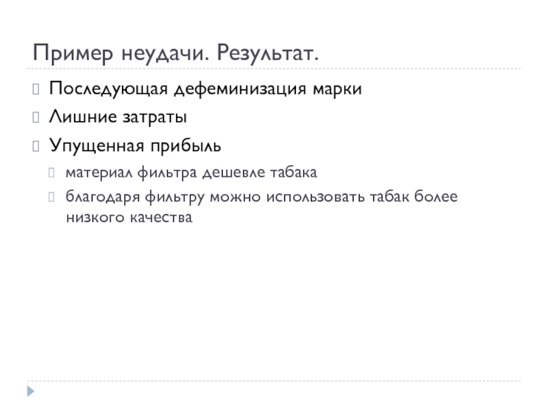 Пример неудачи. Результат.Последующая дефеминизация маркиЛишние затратыУпущенная прибыльматериал фильтра дешевле табакаблагодаря фильтру можно использовать табак более низкого качества