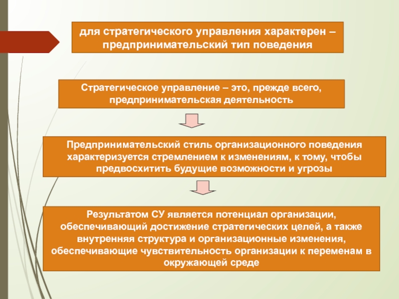 Результатом СУ является потенциал организации, обеспечивающий достижение стратегических целей, а также внутренняя структура и организационные изменения, обеспечивающие чувствительность организации к переменам в окружающей среде