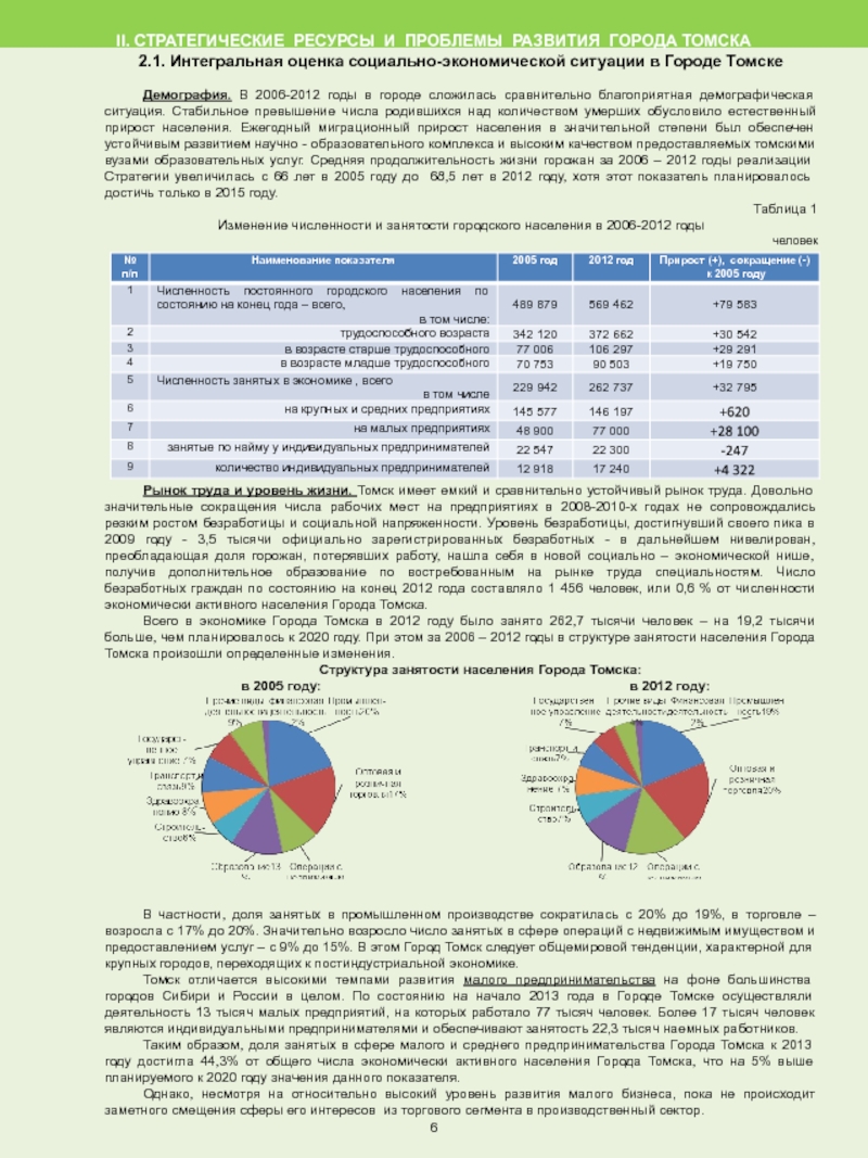 Демография. В 2006-2012 годы в городе сложилась сравнительно благоприятная демографическая ситуация. Стабильное превышение числа родившихся над количеством умерших обусловило естественный прирост населения. Ежегодный миграционный прирост населения в значительной степени был обеспечен устойчивым развитием научно - образовательного комплекса и высоким качеством предоставляемых томскими вузами образовательных услуг. Средняя продолжительность жизни горожан за 2006 – 2012 годы реализации Стратегии увеличилась с 66 лет в 2005 году до 68,5 лет в 2012 году, хотя этот показатель планировалось достичь только в 2015 году.