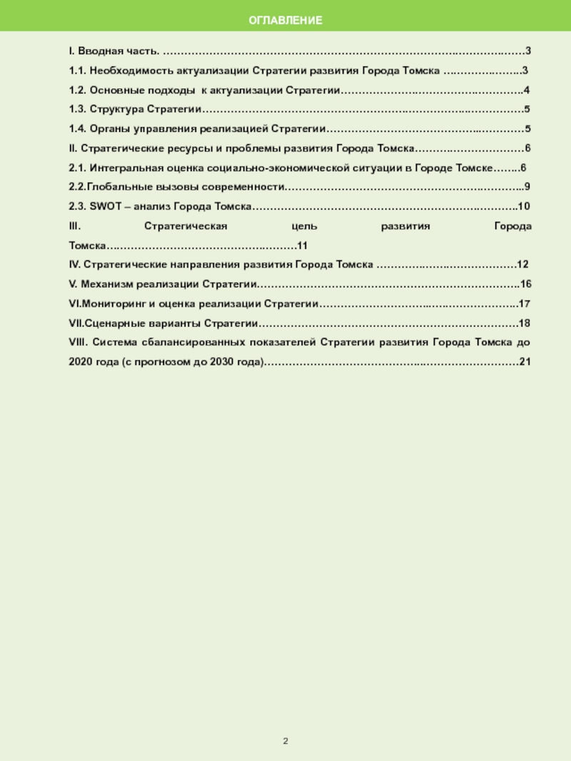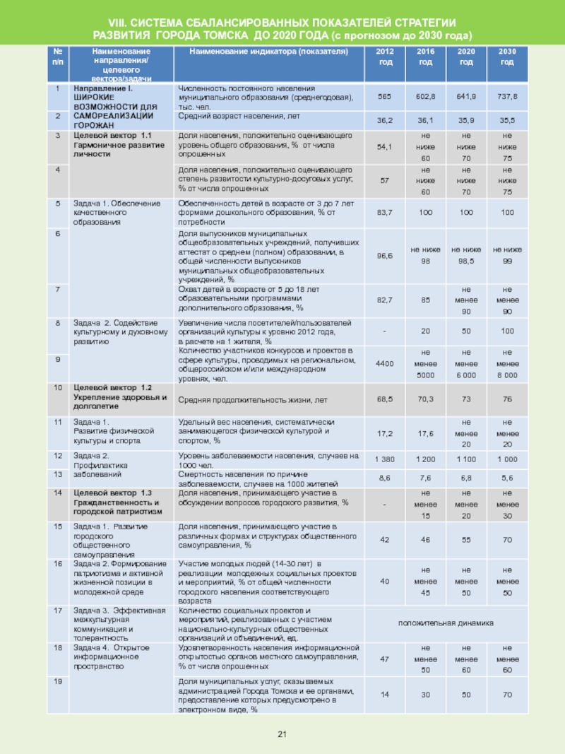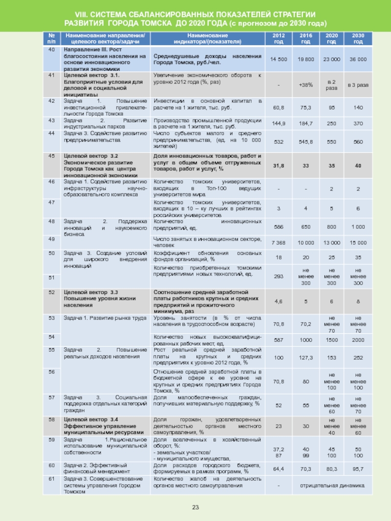 Актуализация Стратегии позволила уточнить целевые векторы и задачи по каждому стратегическому направлению на период до 2020 года и сформировать значения индикаторов достижения стратегической цели с учетом прогноза основных показателей развития Города Томска до 2030 года.
