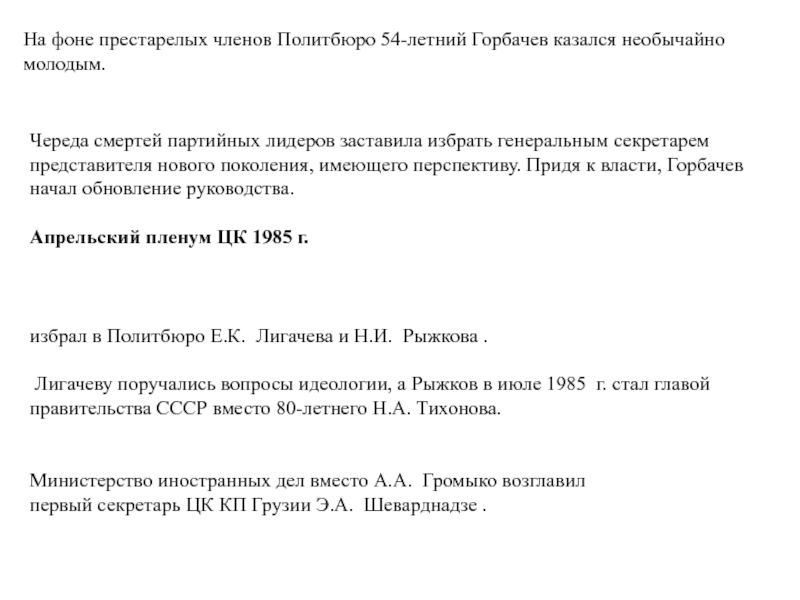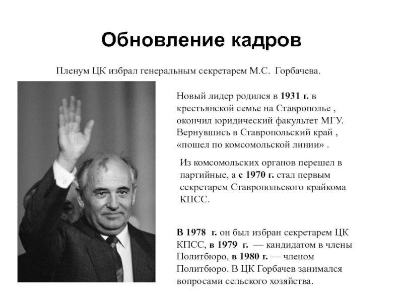 В 1978 г. он был избран секретарем ЦК КПСС, в 1979 г. — кандидатом в члены Политбюро, в 1980 г. — членом Политбюро. В ЦК Горбачев занимался вопросами сельского хозяйства.