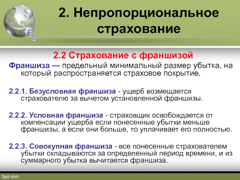 Слайд 142.2 Страхование с франшизой