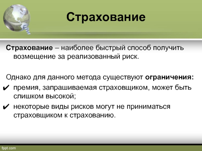 Страхование – наиболее быстрый способ получить возмещение за реализованный риск.