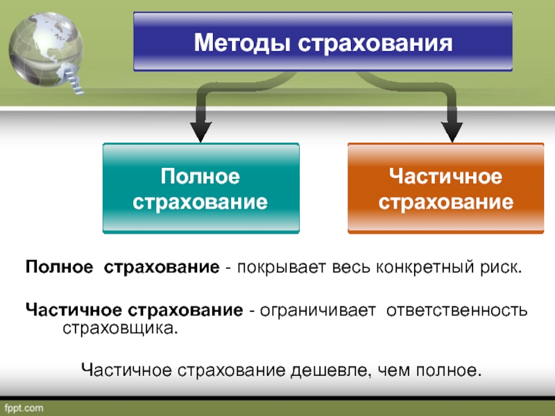 Слайд 8Полное страхование - покрывает весь конкретный риск.