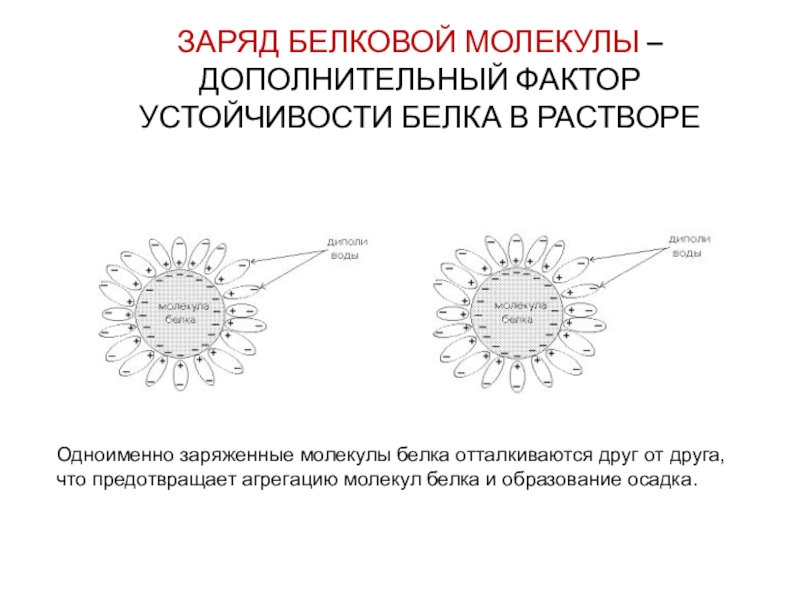 Слайд 28ЗАРЯД БЕЛКОВОЙ МОЛЕКУЛЫ – ДОПОЛНИТЕЛЬНЫЙ ФАКТОР УСТОЙЧИВОСТИ БЕЛКА В РАСТВОРЕ
