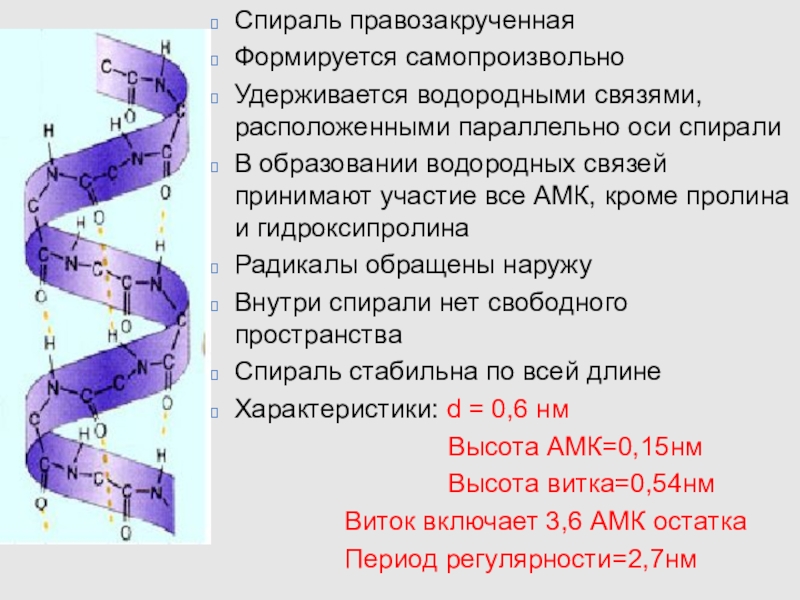 Удерживается водородными связями, расположенными параллельно оси спирали