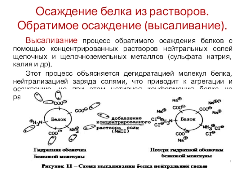 Этот процесс объясняется дегидратацией молекул белка, нейтрализацией заряда солями, что приводит к агрегации и осаждению, но при этом нативная конформация белка не разрушается.