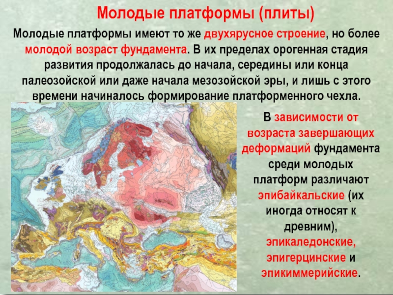 В зависимости от возраста завершающих деформаций фундамента среди молодых платформ различают эпибайкальские (их иногда относят к древним), эпикаледонские, эпигерцинские и эпикиммерийские.