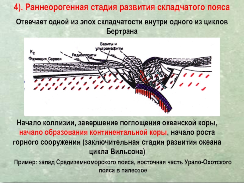 3) Замыкание (прекращение существования) океанических бассейнов в результате столкновения ограничивающих их континентов.