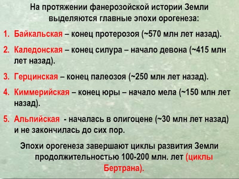 в эпохи орогенеза: байкальскую, каледонскую, герцинскую, киммерийскую, альпийскую
