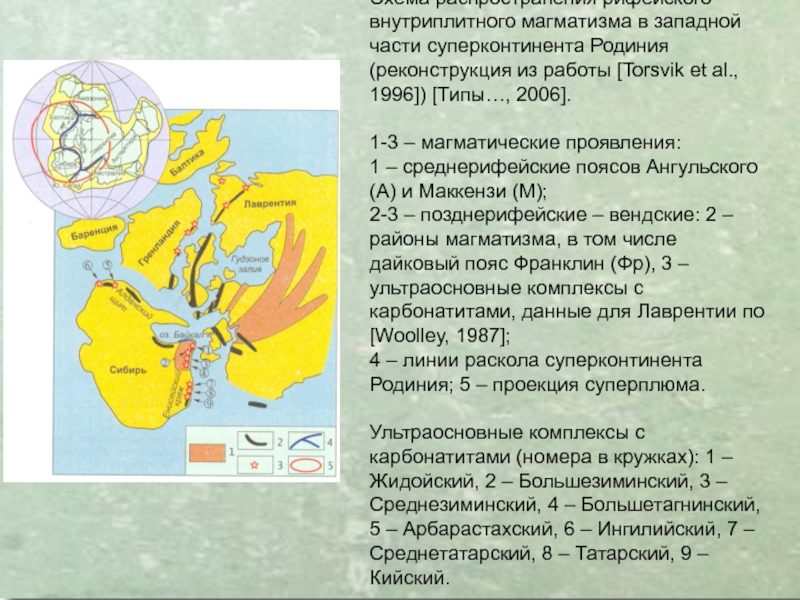 Слайд 18Схема распространения рифейского внутриплитного магматизма в западной части суперконтинента Родиния