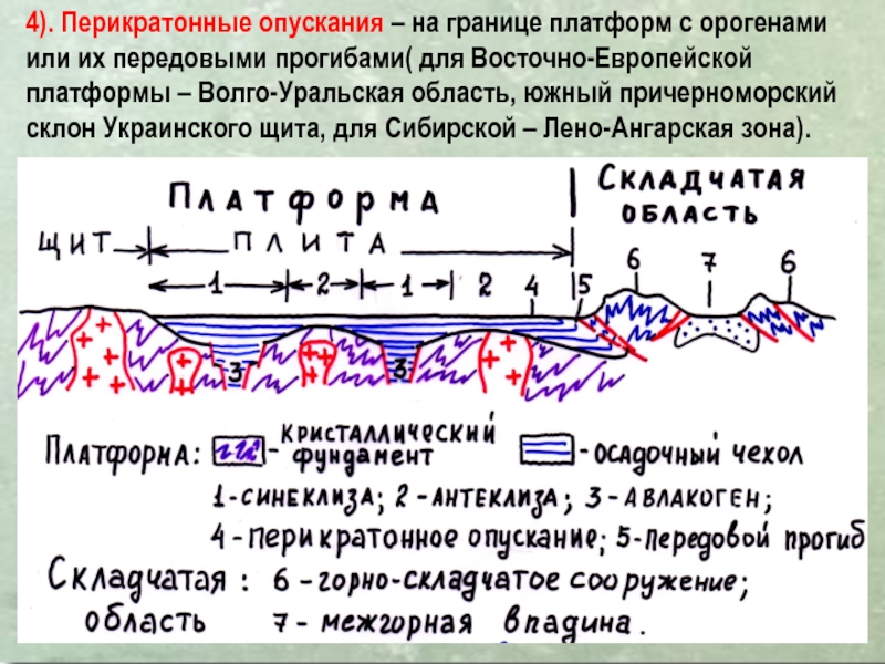 Слайд 844). Перикратонные опускания – на границе платформ с орогенами или