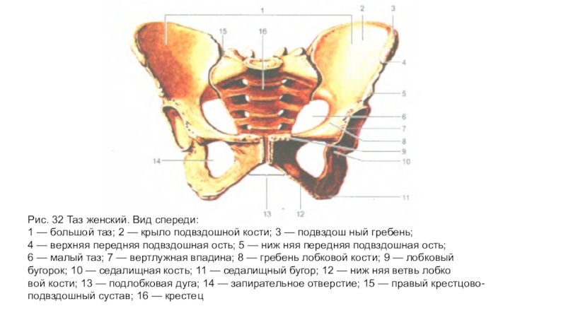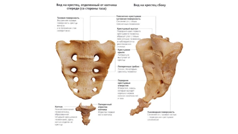 одну тазовую кость. Сращенные тела этих костей образуют вертлужную впадину, являющуюся суставной ямкой (поверхностью) для сочленения с головкой бедренной кости. Подвздошная кость, включающая в себя тело и крыло, расположена над вертлужной впадиной. Седалищная кость находится снизу и сзади от вертлужной впадины и состоит из тела и ветви. Эта кость имеет седалищный бугор и седалищную ость. Выше и ниже ости находятся большая и малая седалищные ырезки. Лобковая кость располагается кпереди и книзу от вертлужной впадины, имеет тело, верхнюю и нижнюю ветви. Тазовые кости сзади сочленяются с крестцом, спереди — друг с другом и образуют костный таз