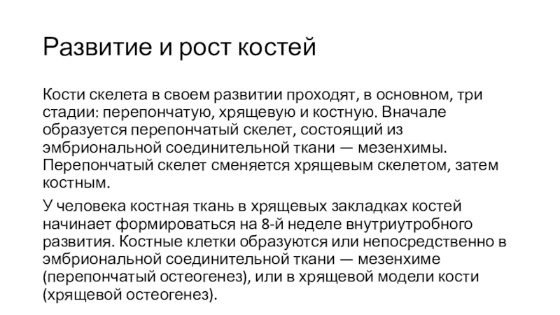 У человека костная ткань в хрящевых закладках костей начинает формироваться на 8-й неделе внутриутробного развития. Костные клетки образуются или непосредственно в эмбриональной соединительной ткани — мезенхиме (перепончатый остеогенез), или в хрящевой модели кости (хрящевой остеогенез).