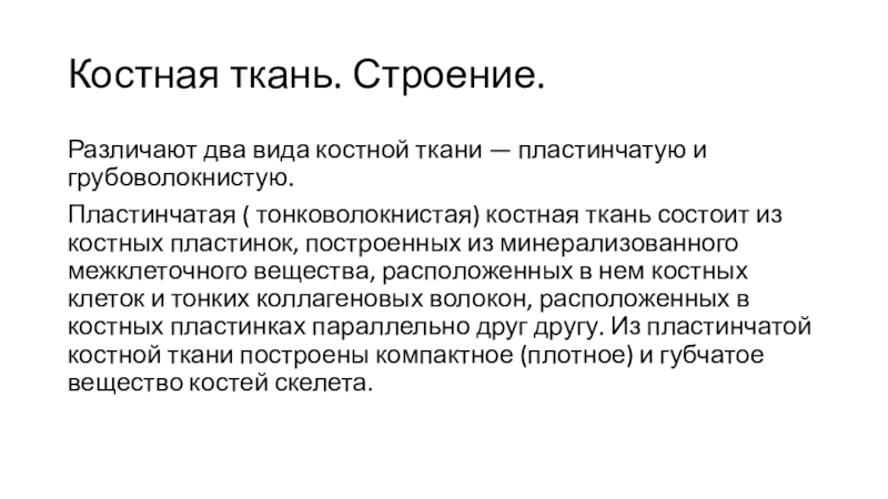 из минерализованного межклеточного вещества, расположенных в нем костных клеток и тонких коллагеновых волокон, расположенных в костных пластинках параллельно друг другу. Из пластинчатой костной ткани построены компактное (плотное) и губчатое вещество костей скелета.