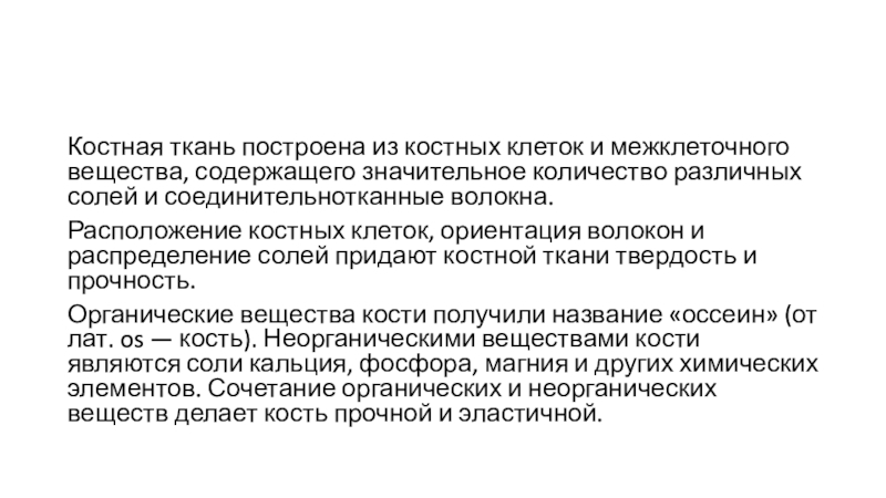 Органические вещества кости получили название «оссеин» (от лат. os — кость). Неорганическими веществами кости являются соли кальция, фосфора, магния и других химических элементов. Сочетание органических и неорганических веществ делает кость прочной и эластичной.