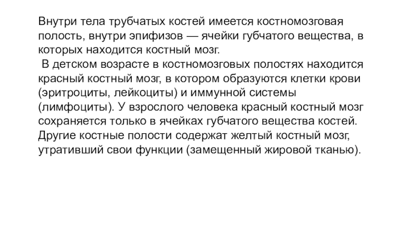 Слайд 10Внутри тела трубчатых костей имеется костномозговая полость, внутри эпифизов —