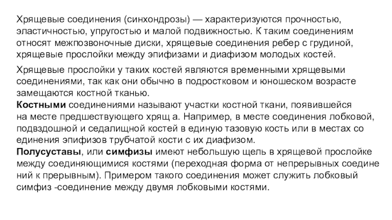 Хрящевые соединения — синхондрозы определяются в области основания черепа. Это соединение между телом клиновидной кости и базилярной частью затылочной кости и другие синхондрозы, которые хорошо выражены у детей. У взрослого человека в большинстве своем эти синхондрозы замещаются костной тканью.