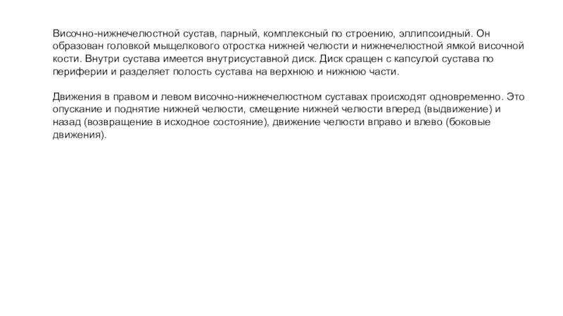 Слайд 45Височно-нижнечелюстной сустав, парный, комплексный по строению, эллипсоидный. Он образован головкой