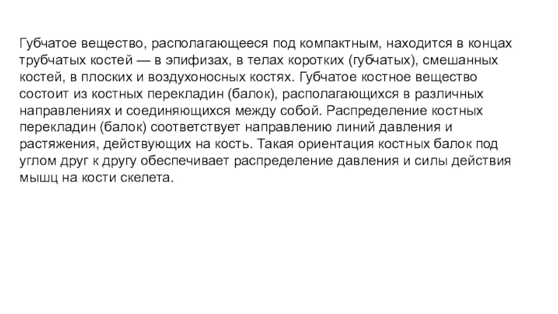 и воздухоносных костях. Губчатое костное вещество состоит из костных перекладин (балок), располагающихся в различных направлениях и соединяющихся между собой. Распределение костных перекладин (балок) соответствует направлению линий давления и растяжения, действующих на кость. Такая ориентация костных балок под углом друг к другу обеспечивает распределение давления и силы действия мышц на кости скелета.