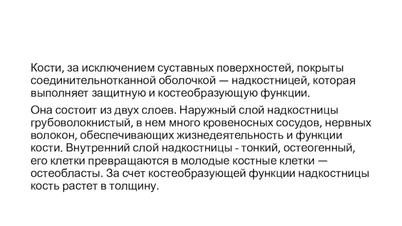Слайд 8Кости, за исключением суставных поверхностей, покрыты соединительнотканной оболочкой — надкостницей,