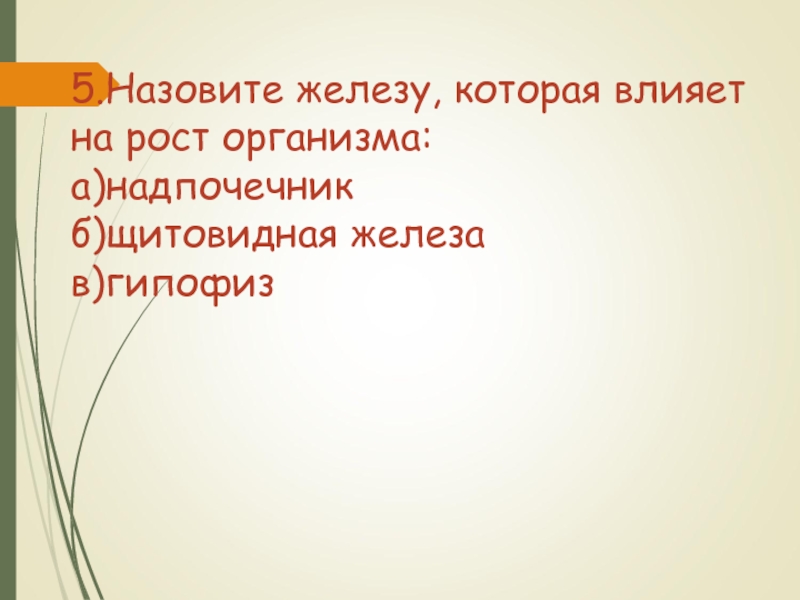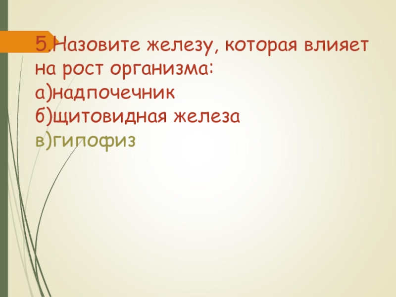 Слайд 415.Назовите железу, которая влияет на рост организма: а)надпочечник б)щитовидная железа в)гипофиз