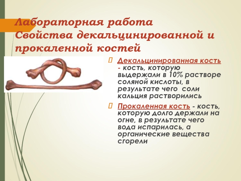 Лабораторная работа Свойства декальцинированной и прокаленной костей Декальцинированная кость - кость, которую выдержали в 10% растворе соляной