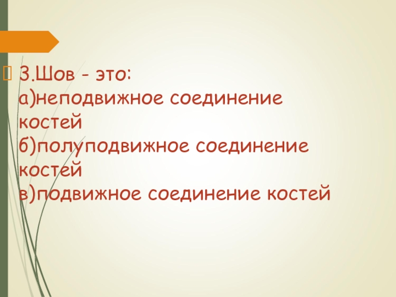 Слайд 293.Шов - это: а)неподвижное соединение костей б)полуподвижное соединение костей в)подвижное соединение костей