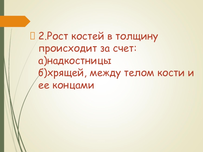 2.Рост костей в толщину происходит за счет: а)надкостницы б)хрящей, между телом кости и ее концами