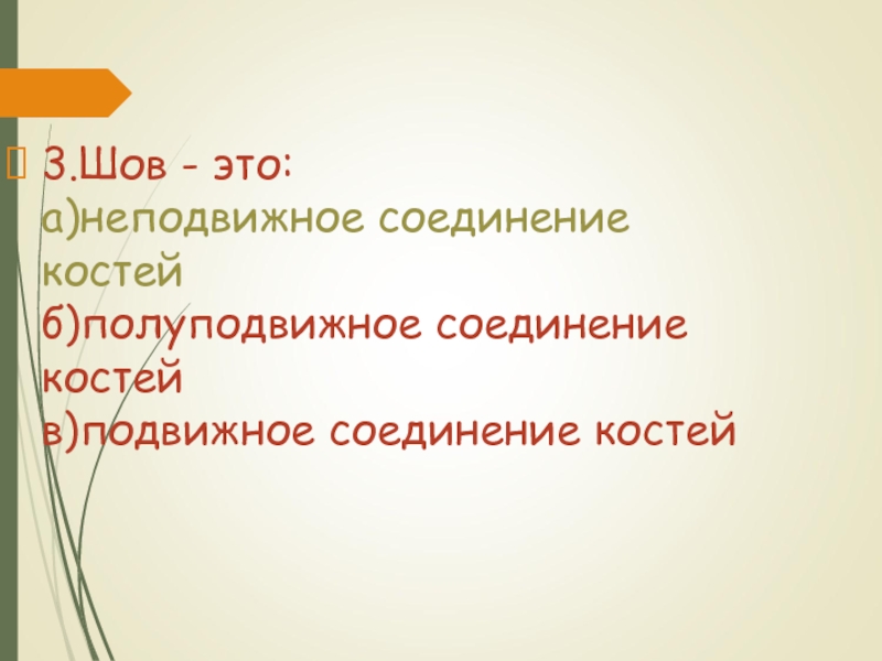 Слайд 373.Шов - это: а)неподвижное соединение костей б)полуподвижное соединение костей в)подвижное соединение костей