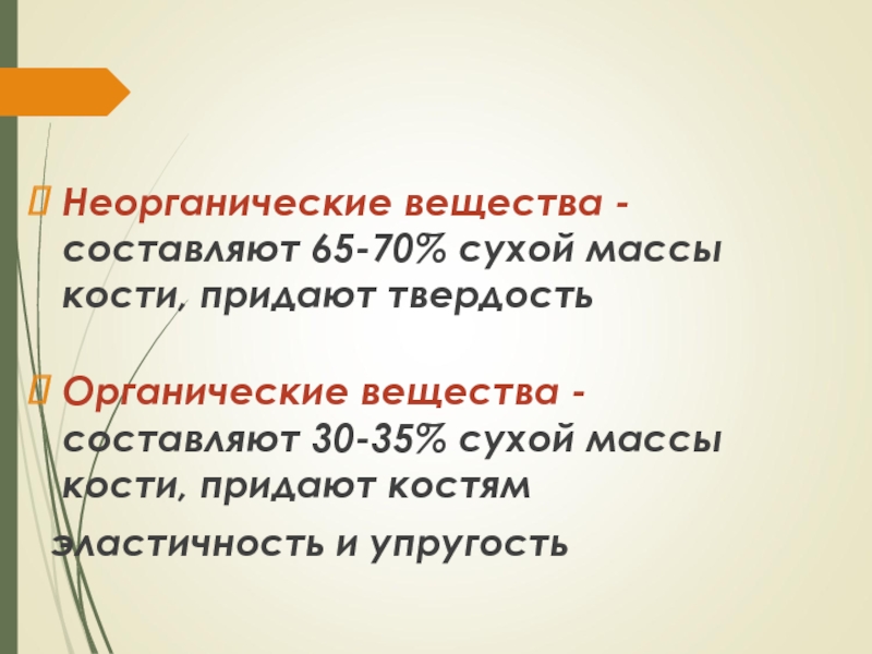 Неорганические вещества - составляют 65-70% сухой массы кости, придают твердостьОрганические вещества - составляют 30-35% сухой массы кости,