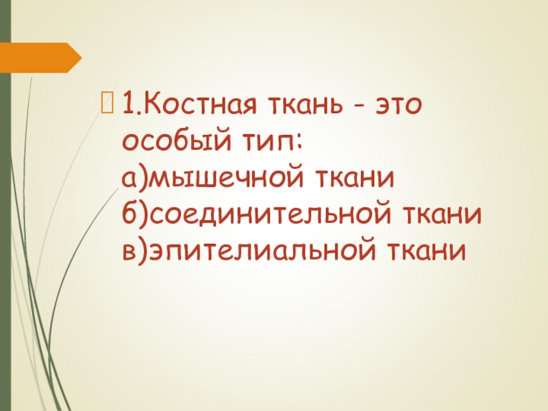 Слайд 321.Костная ткань - это особый тип: а)мышечной ткани б)соединительной ткани в)эпителиальной ткани