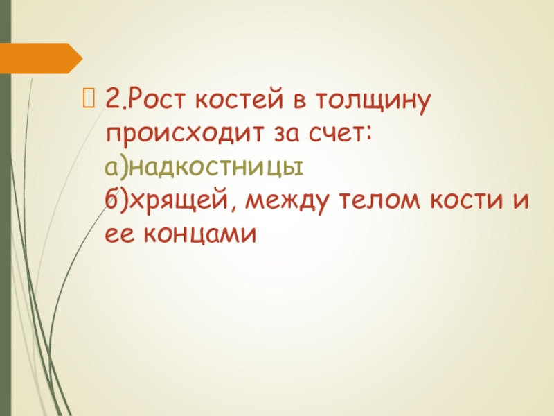 Слайд 282.Рост костей в толщину происходит за счет: а)надкостницы б)хрящей, между телом кости