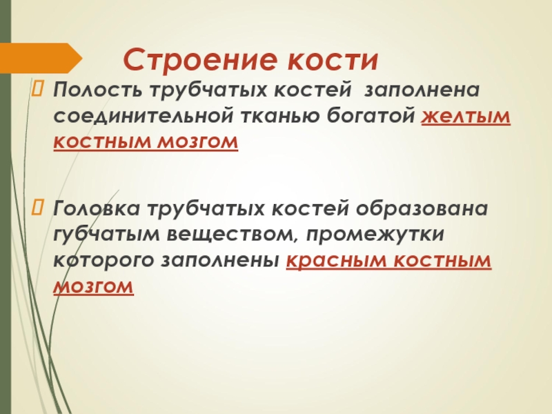 Строение кости  Полость трубчатых костей заполнена соединительной тканью богатой желтым костным мозгомГоловка трубчатых костей образована губчатым