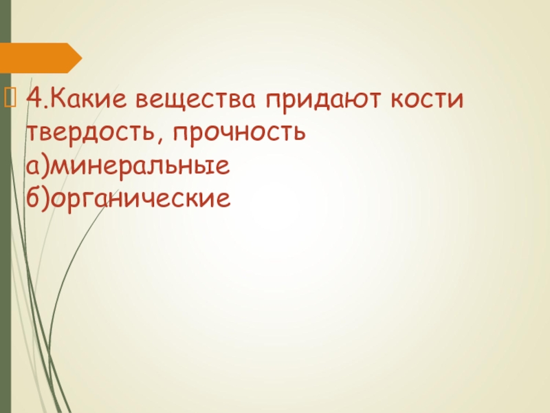 Слайд 384.Какие вещества придают кости твердость, прочность а)минеральные б)органические