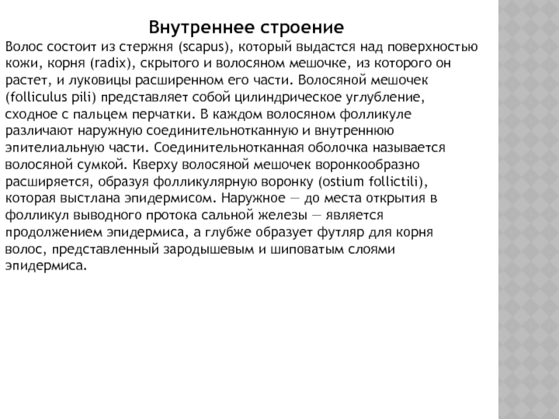 состоит из стержня (scapus), который выдастся над поверхностью кожи, корня (radix), скрытого и волосяном мешочке, из которого он растет, и луковицы расширенном его части. Волосяной мешочек (folliculus pili) представляет собой цилиндрическое углубление, сходное с пальцем перчатки. В каждом волосяном фолликуле различают наружную соединительнотканную и внутреннюю эпителиальную части. Соединительнотканная оболочка называется волосяной сумкой. Кверху волосяной мешочек воронкообразно расширяется, образуя фолликулярную воронку (ostium follictili), которая выстлана эпидермисом. Наружное — до места открытия в фолликул выводного протока сальной железы — является продолжением эпидермиса, а глубже образует футляр для корня волос, представленный зародышевым и шиповатым слоями эпидермиса.