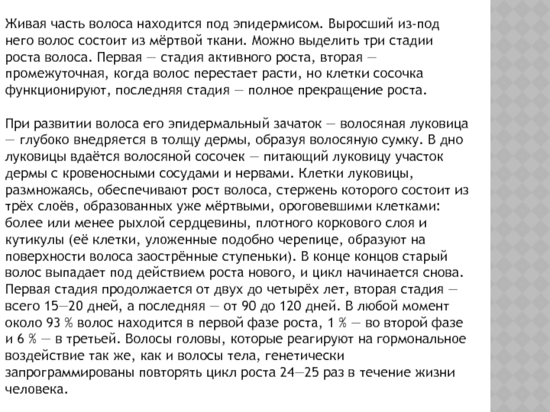 состоит из мёртвой ткани. Можно выделить три стадии роста волоса.