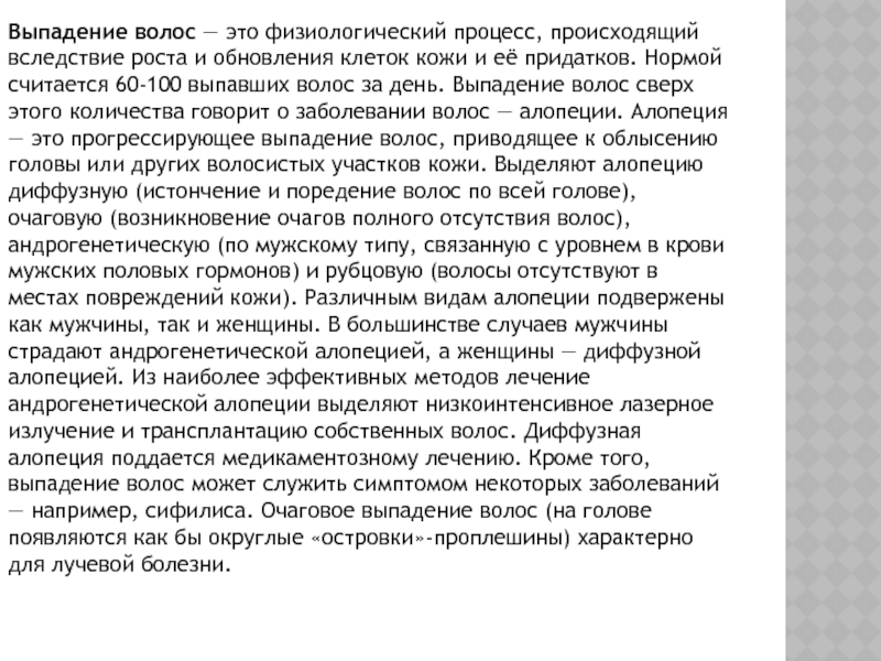 волос за день. Выпадение волос сверх этого количества говорит о заболевании волос — алопеции. Алопеция — это прогрессирующее выпадение волос, приводящее к облысению головы или других волосистых участков кожи. Выделяют алопецию диффузную (истончение и поредение волос по всей голове), очаговую (возникновение очагов полного отсутствия волос), андрогенетическую (по мужскому типу, связанную с уровнем в крови мужских половых гормонов) и рубцовую (волосы отсутствуют в местах повреждений кожи). Различным видам алопеции подвержены как мужчины, так и женщины. В большинстве случаев мужчины страдают андрогенетической алопецией, а женщины — диффузной алопецией. Из наиболее эффективных методов лечение андрогенетической алопеции выделяют низкоинтенсивное лазерное излучение и трансплантацию собственных волос. Диффузная алопеция поддается медикаментозному лечению. Кроме того, выпадение волос может служить симптомом некоторых заболеваний — например, сифилиса. Очаговое выпадение волос (на голове появляются как бы округлые «островки»-проплешины) характерно для лучевой болезни.