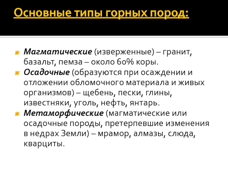 Метаморфические (магматические или осадочные породы, претерпевшие изменения в недрах Земли) – мрамор, алмазы, слюда, кварциты.