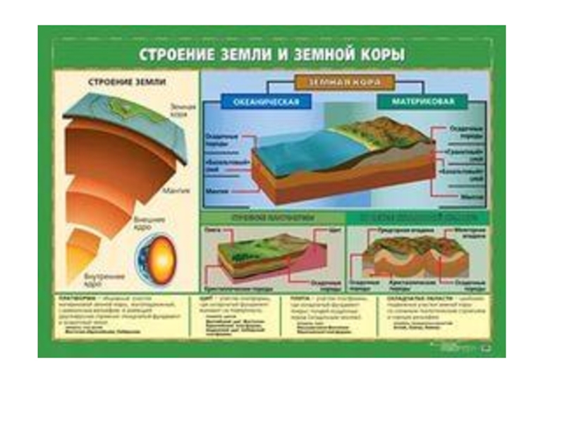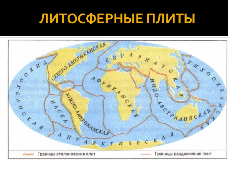Вся поверхность Земли (включая океаны!) представляет собой как бы гигантскую мозаику, собранную из литосферных плит (Евразийская, Африканская, Североамериканская, Южноамериканская, Тихоокеанская, Индо-Австралийская, Антарктическая).