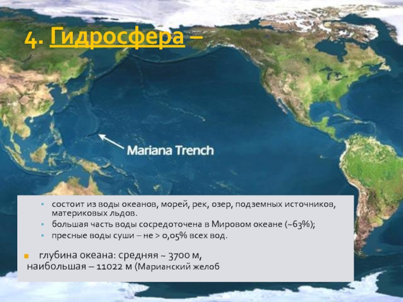 большая часть воды сосредоточена в Мировом океане (~63%);