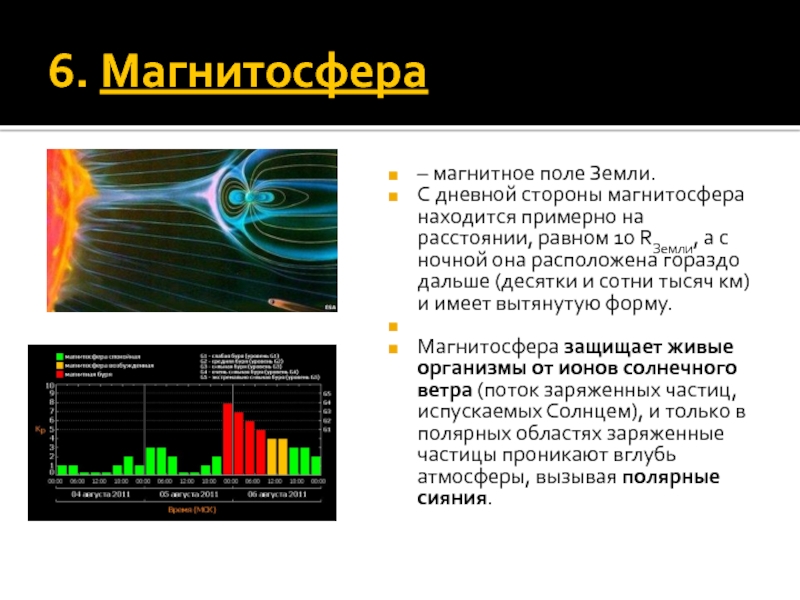 Магнитосфера защищает живые организмы от ионов солнечного ветра (поток заряженных частиц, испускаемых Солнцем), и только в полярных областях заряженные частицы проникают вглубь атмосферы, вызывая полярные сияния.