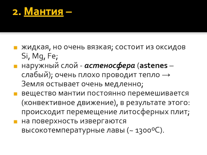 вещество мантии постоянно перемешивается (конвективное движение), в результате этого: происходит перемещение литосферных плит;