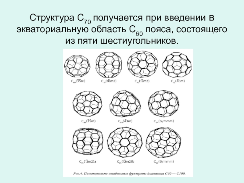 Слайд 40Структура С70 получается при введении в экваториальную область С60 пояса,