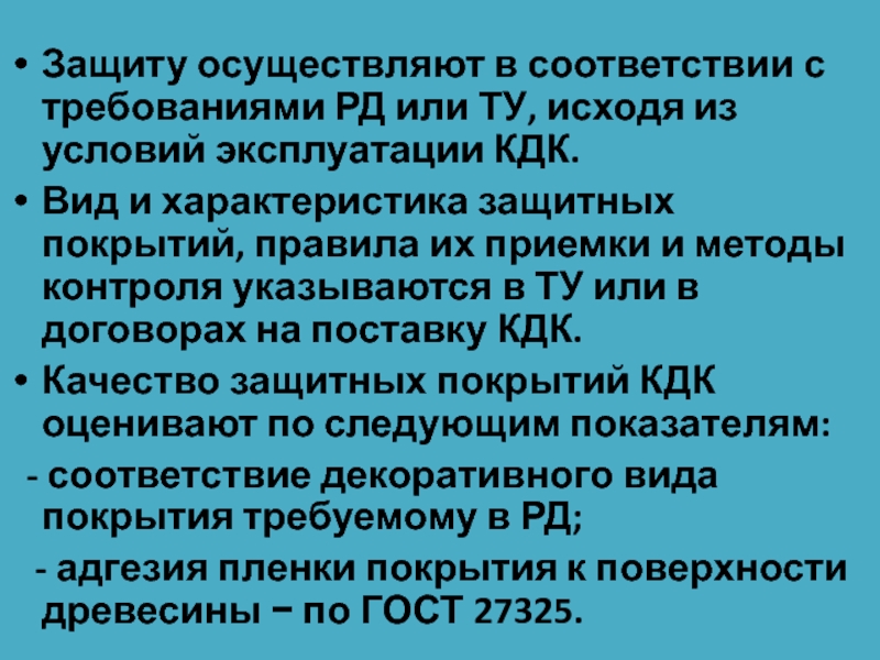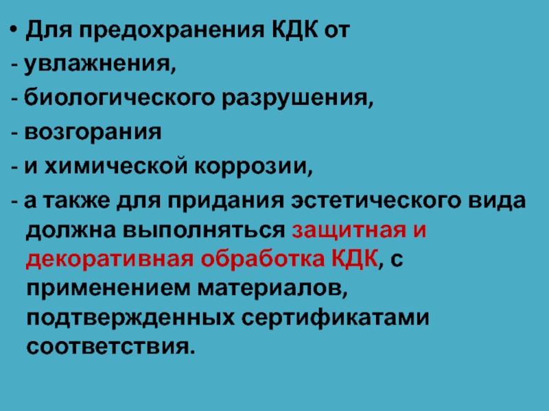 а также для придания эстетического вида должна выполняться защитная и декоративная обработка КДК, с применением материалов, подтвержденных сертификатами соответствия.